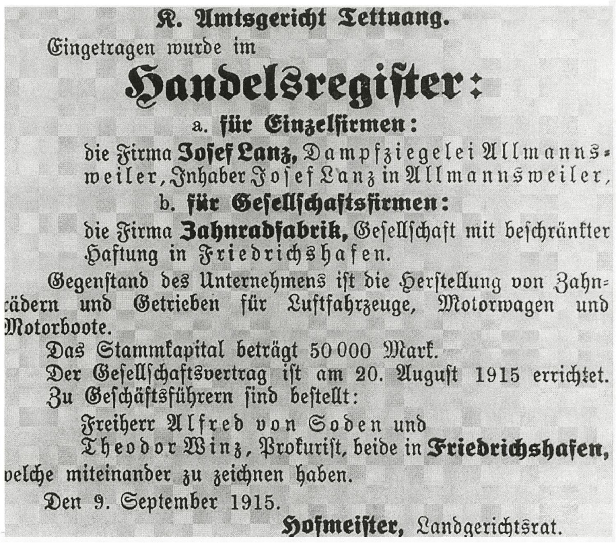 Понад сто років тому троє новаторів заснували на Боденському озері компанію з простою назвою «Zahnradfabrik» (завод шестерень). Згодом цей невеликий виробник трансмісій перетворився на потужну технологічну групу, яка з 1992 року відома як ZF Friedrichshafen AG.