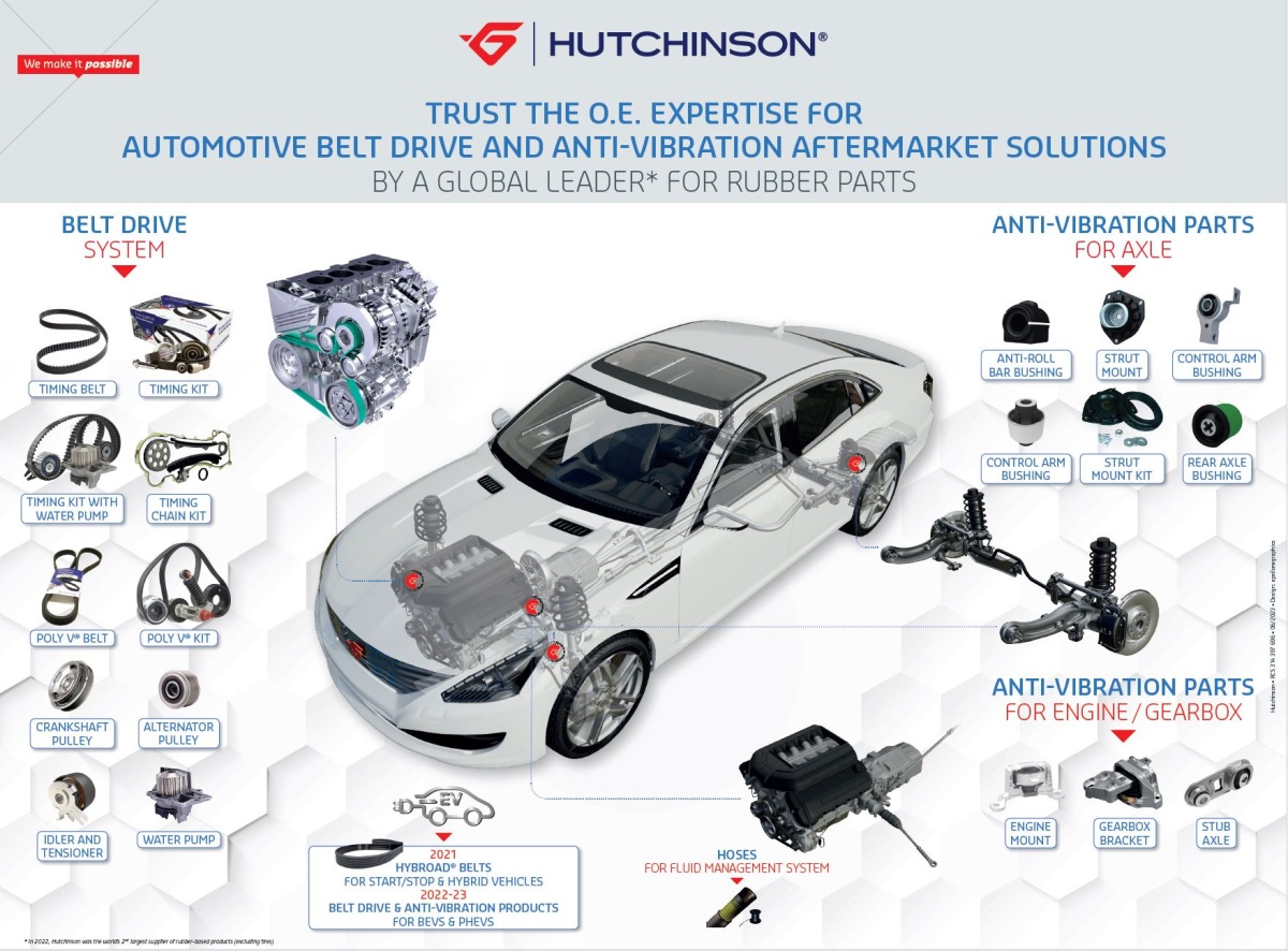 Hutchinson є провідним виробником технологій трансмісії, сучасних систем ремінного приводу та антивібраційних компонентів для ринку оригінального обладнання (OE) та незалежного ринку запчастин. Маючи понад 170 років досвіду, Hutchinson є визнаним експертом у сфері якості та інновацій в автомобільній промисловості.