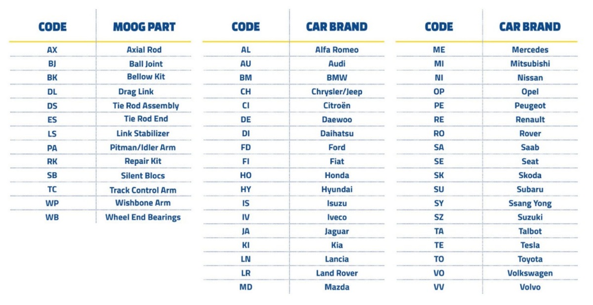 MOOG пропонує широкий асортимент автомобільних деталей для систем керування та підвіски легкових автомобілів. Існує понад 10 000 номерів деталей для різних категорій продукції, і всі вони чітко марковані для ідентифікації. Саме тому MOOG розробив інтуїтивно зрозумілу систему нумерації деталей.