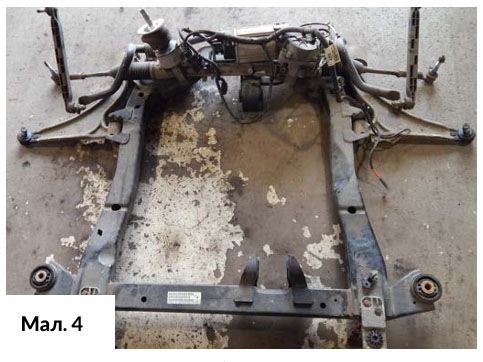 Після того, як двигун та трансмісія були повністю зафіксовані, були відкручені чотири болти кріплення підрамника, а весь підрамник (включаючи рульову рейку, стійку стабілізатора та нижні важелі) покладений на підлогу. (Мал. 4)