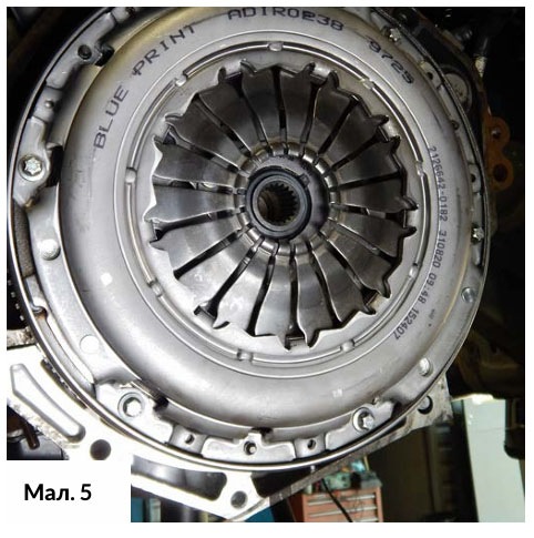 Нові болти маховика були затягнуті до рекомендованих значень, комплект зчеплення був суміщений та потім встановлений на маховик. (Мал. 5)