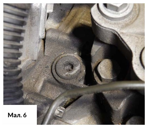 Автомобіль опустили на підлогу, через заливну горловину у верхній частині трансмісії її було заповнено свіжою оливою; необхідний робочий об’єм становить 1,76 літра. Після цього було встановлено вилку зчеплення. (Мал. 6)