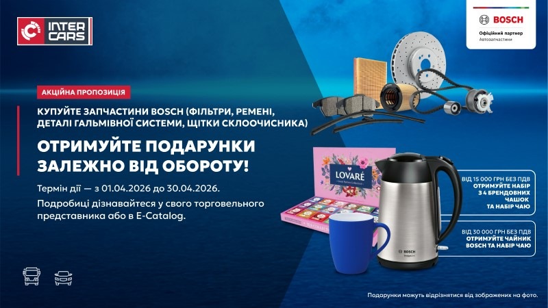 Купуйте запчастини BOSCH (фільтри, ремені, деталі гальмівної системи, щітки склоочисника) з асортименту Inter Cars Ukraine та отримуйте подарунки залежно від обороту!